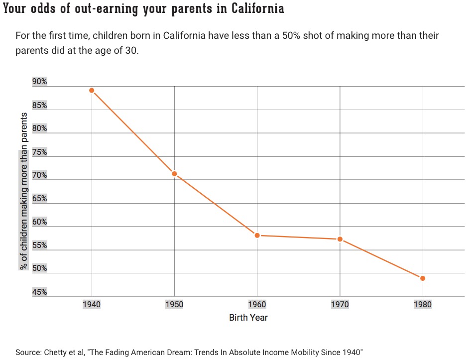 Children born in California have a less than 50% change of making more than their parent did at 30 years of age.